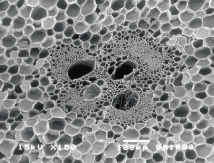 竹そのものの組織とほとんど変わらない。中央部が維管束で周囲を埋めているのは柔組織で通常は細胞内にデンプンが貯蔵されている。