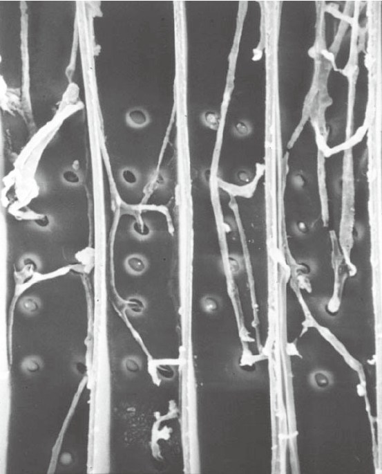 写真は腐朽菌が木材の細胞壁を攻撃中のものであるが、菌糸の先端部がピットの穴を選んで入り込んでいるようすがみられる。菌糸は木材に取り付くと内部まで侵入していくが、通常は木材細胞の液体通路の穴をうまく利用して侵入していく。難注入性でも耐久性の低いスプルースなどの木材ではこの菌糸の侵入も容易に起こることが予測されるため、強度が低下しない程度にちょっと腐らせた木材が調製できれば、注入性向上も実現するだろう。というわけで、私は以前にある企業の方と無理に木材を腐朽させて、薬剤(この時は強化樹脂の注入であったが)の浸透促進をはかったことがある。しかし、実際は無残にも失敗してしまった。使い物にならないくらい、本当に腐ってしまったのがその原因である。